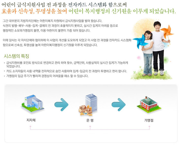 아동급식을 전자카드를 사용 하여 시스템화 하여 어린이 급식을 좀더 투명 하게 만들고 신속 하게 업무 처리를 할수 있어 실시간으로 식사와 부식등을 신속 하게 전달 할수 있습니다.