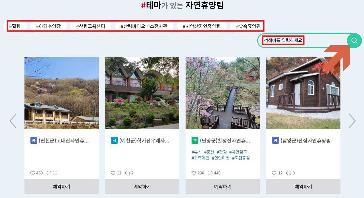 자신이 원하는 자연휴양림 검색도 가능 합니다. 테마가 있는 자연휴양림 에서 자신이 원하는 휴양림 검색어를 입력 하면 검색 할수 있습니다. 자연휴양림 여행정보를 볼수 있어 숲나들e 홈페이지 정말 유용 한거 같습니다.